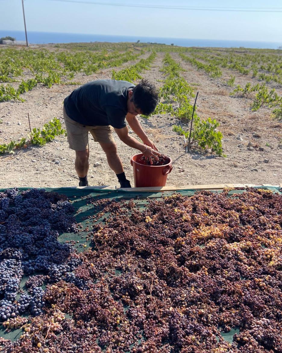 Aujourd’hui, c’est 12ha de vignes dont une petite partie est consacrée à l’expérimentation de 5 clones d’Assyrtiko. À terme, le vignoble pourrait représenter 24 ha dont 6h seront plantés à Thirassa, l’île qui fait face à la caldera de Santorin et dont les sols sont, en tout point identiques à ceux de Vorvoulos, des basaltes et c’est de ce terroir que Vassaltis tire son nom. C’est pour se soustraire aux pressions qu’exerce le marché sur les prix de l’Assyrtiko et s’assurer des approvisionnements, que Yannis consacre autant de moyen à mettre en place de nouveaux vignobles. À ce jour la répartition des cépages va comme suit : Αssyrtiko (80%), Mavrotragano (15%), Aidani (5%).